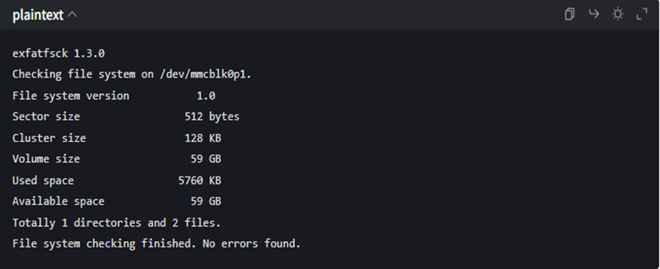 预期结果:fsck.exfat能自动修复损坏的元数据(如“修复损坏的目录项”),未写完的文件会被标记为无效并删除,无“坏簇”或“数据丢失”;重新录制时SD卡能正常挂载。