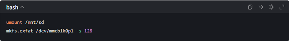 3. 格式化SD卡:mkfs.exfat /dev/mmcblk0p1 -s 128。