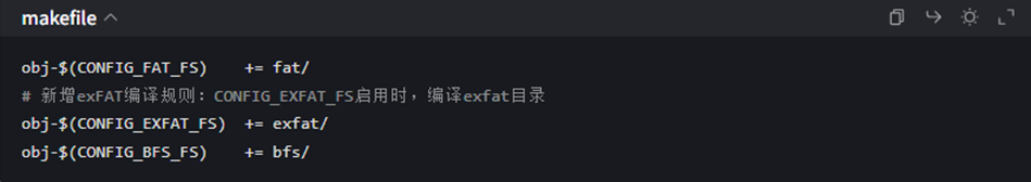 修改文件:`/BSP/linux-kernel/fs/Makefile`,在FAT驱动编译规则后添加exFAT的规则: