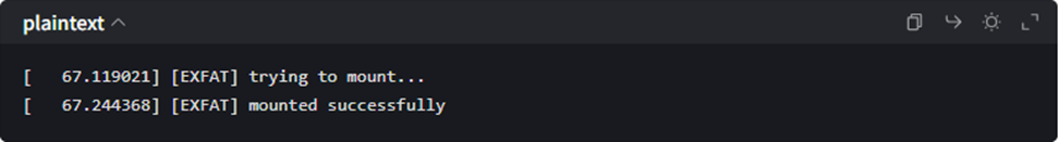 若输出类似以下日志,且`mount`命令能看到exFAT类型的挂载信息,说明内置驱动正常工作: