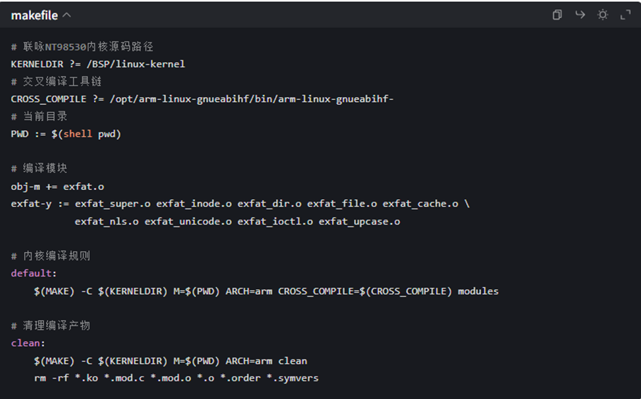 在/code/driver/source/fs/exfat/目录下创建Makefile,内容如下(需根据实际路径修改KERNELDIR与CROSS_COMPILE):