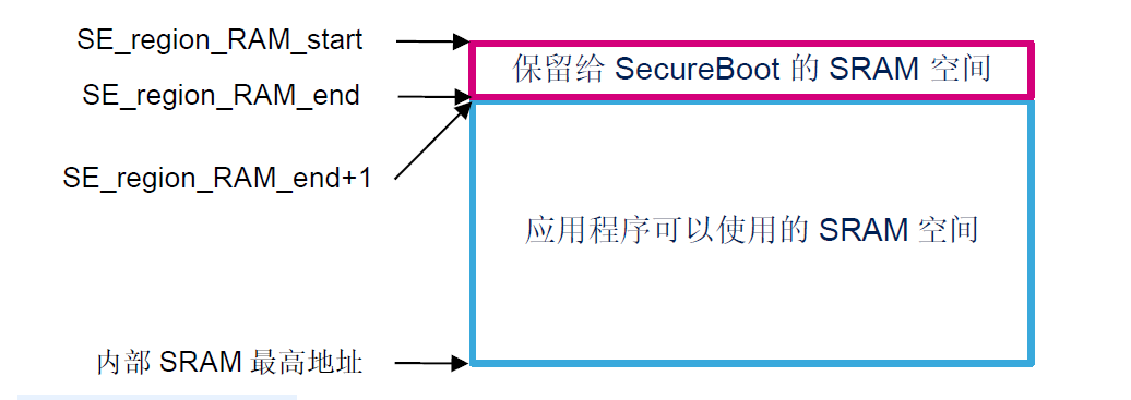 通常情况下,安全启动只在运行期间使用SRAM,跳转到应用程序之后,SRAM会被释放给应用程序使用,因此应用程序可以使用所有的SRAM空间。但是在某些平台的SBSFU参考实现中,部分SRAM会保留给安全启动代码使用,主要涉及带有Firewall硬件的L4/L0系列,以及SBSFU中包含KMS功能,启动后SecureEngine依旧可能给应用程序提供密钥管理服务的情况。这时候应用程序的linker file中指定 的SRAM的空间应该从SE_region_RAM_end地址之后开始,如图2所示: