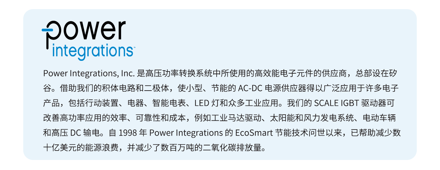Power Integrations推出 TinySwitch™-5,将最受欢迎的整合式脱机开关 IC 系列的输出功率扩展至 175 W,广泛应用于家电、运算、通讯、工业和医疗应用的偏压电源和辅助电源。TinySwitch IC 率先采用了 Power Integrations 屡获殊荣的 EcoSmart™ 技术,自 1998 年以来透过大幅降低待机功耗,配备先进的控制引擎,可无缝管理开关频率和功率输送,即使在轻载条件下也能最大限度地提高效率。这使得电源能够轻松满足欧盟委员会能源相关产品 (ErP) 指令 2009/125/EC 规定的 300 mW 轻载功耗限值。