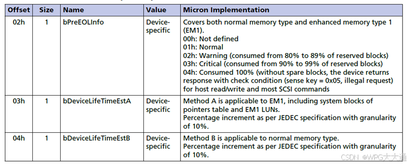 bPreEOLInfo通过用于坏块管理的预留块消耗百分比来反映有关设备寿命的信息。bDeviceLifeTimeEstA 和 bDeviceLifeTimeEst则根据编程/擦除(P/E)周期的数量反映设备已使用寿命的百分比。