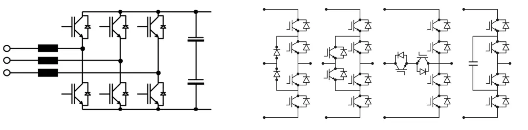 PWM全控整流通过调节 IGBT 的占空比,可将输入侧交流电流控制为正弦波,从而大大降低电流谐波失真,提高功率因数。也可以使用碳化硅 MOSFET 代替硅 IGBT,从而简化拓扑。响应速度快,电能质量好,无需整流变压器。主要拓扑有两电平的B6和3电平。