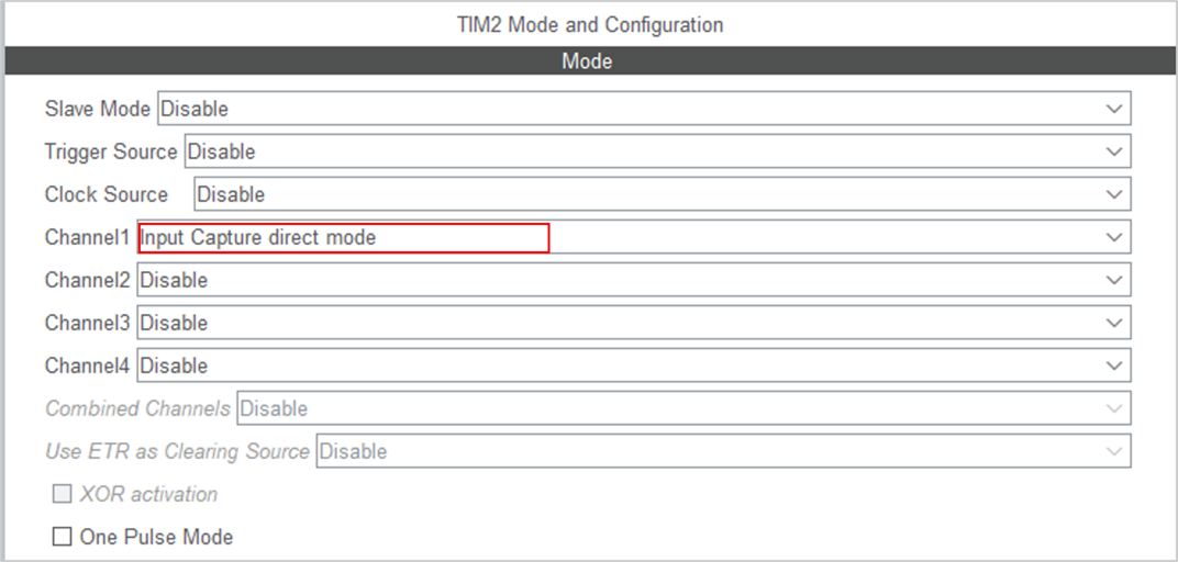 - 选择TIM2并为Channel 1 (通道1) 选择 Input capture direct mode (输入捕获直接模式)。