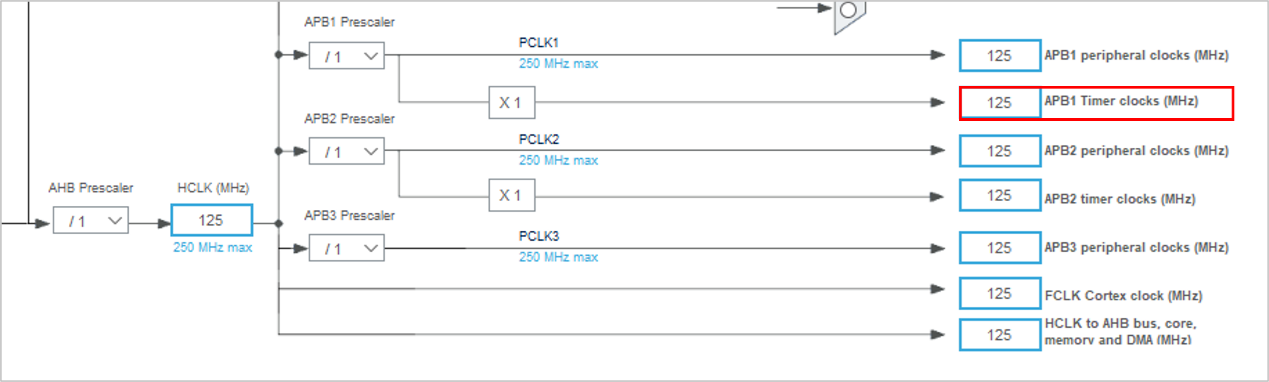 在本示例中,HCLK时钟设置为125MHz。定时器2连接到APB1(请参考数据手册中的框图来检查定时器时钟)。