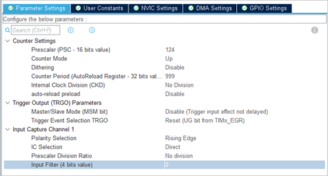 例如,对于期望的1 ms周期,且CK_CNT=1MHz,我们可以选择PSC=124,这将时钟除以125。使用周期公式,ARR=1000-1=999。