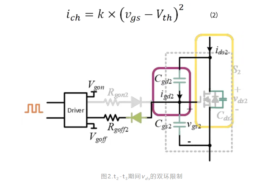 在t2-t3阶段,开关工作在饱和区,vgs与ids的关系如式(2)所示。然而,如图2所示,这一时期的vds受到两个环路的限制,一个是栅极驱动器环路,另一个是功率环路。更多细节将在论文全文中给出。