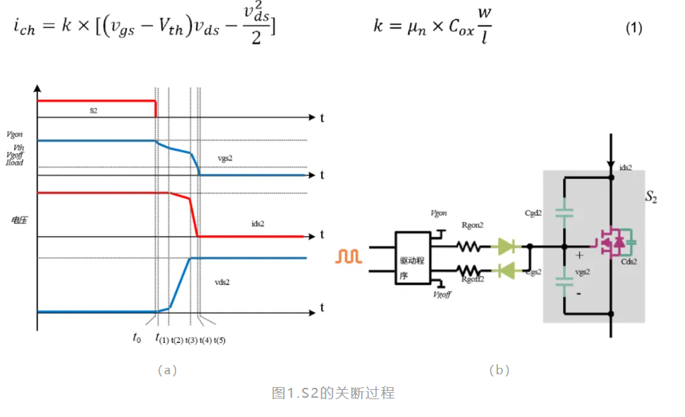 在t1-t2阶段,开关工作在线性区,vgs与vds和ids有关。这一过程可表示为方程(1)。这里的k与器件结构和材料有关。