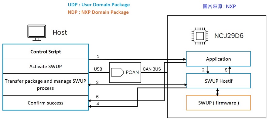 图一. ECU ( Host : PC ) 透过 CAN 汇流排进行软体更新 ( SWUP ) 流程框架: