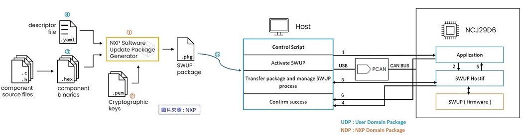 NXP NCJ29D6 是整合了 Ultra-Wideband(UWB)、SPI 与 CAN 等功能的车用芯片,主要用于汽车门禁、车内感测等应用。本篇实作,是使用 NXP官方范例进行验证,目的是先提供明确的实作参考,透过 CAN 汇流排进行软体更新(SWUP - Software Update Program),实现功能升级或错误修复(如图一所示),以便后续移植至车用电子控制单元(ECU)时,过程能更加顺利。