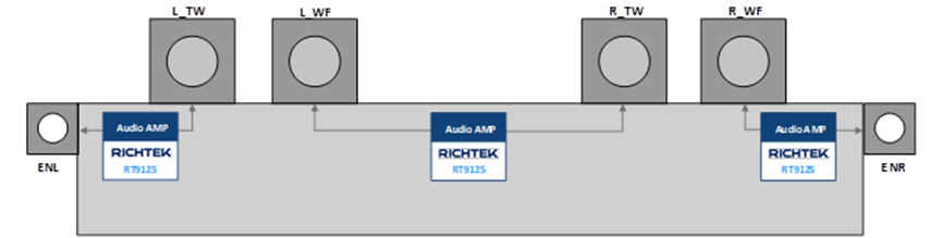 此外,如图4 所示的多声道应用情境中,RT9125 亦可针对每一声道扬声器的特性进行独立的 DRC 优化设定,不仅提升系统设计的灵活性,更可简化 PCB 布线,降低复杂走线所引发的电磁干扰(EMC)。