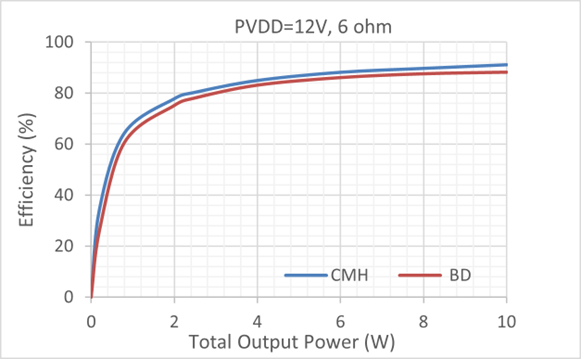 RT9125 采用立錡科技专利的共模跳频(Common Mode Hopping, CMH)技术,专为提升音频放大器在轻载状态下的效率而设计。音频设备在多数日常使用情境中,常处于较低输出功率(例如小于 5W)状态,此时传统 BD 架构仍维持固定的 50% 开关占空比(Duty Cycle),导致较大的电感电流纹波(Ripple Current),从而增加系统功耗。