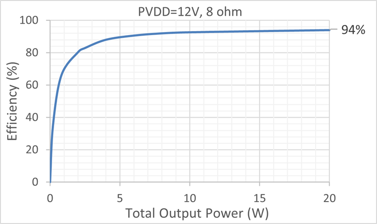 RT9125 在8Ω负载下,支持 2 × 30W 最大输出功率。在 PVDD = 12V / 8Ω、输出功率为 2×10W 条件下,转换效率最高可达 94%。如图5 所示,RT9125 无需额外的外部散热片即可稳定运行,有效降低系统的制造成本。