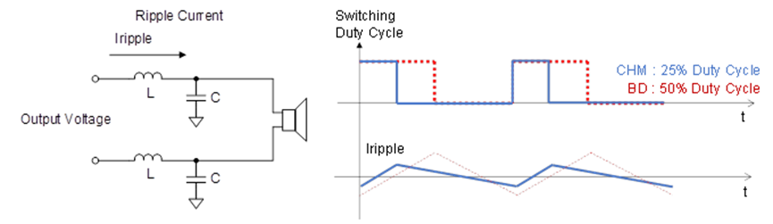 CMH 技术的核心概念是在轻载条件下主动调整开关占空比。如图1 所示,RT9125 将 BD 架构中原本固定的 50% 开关占空比(红色虚线)动态调整至约 25%(蓝色实线),以有效降低电感电流纹波的幅度。