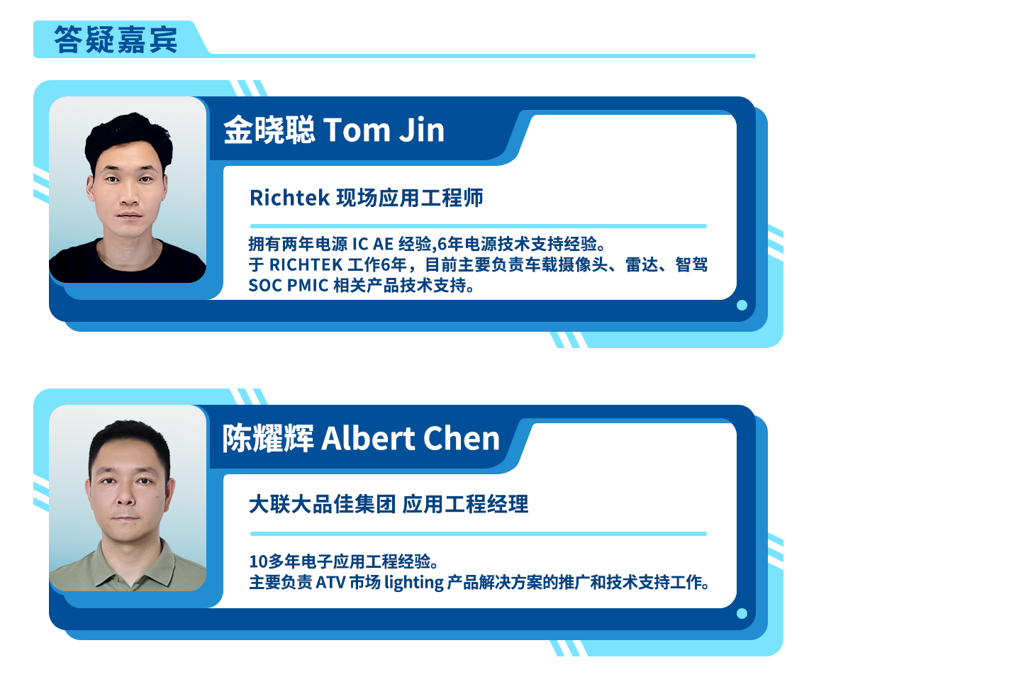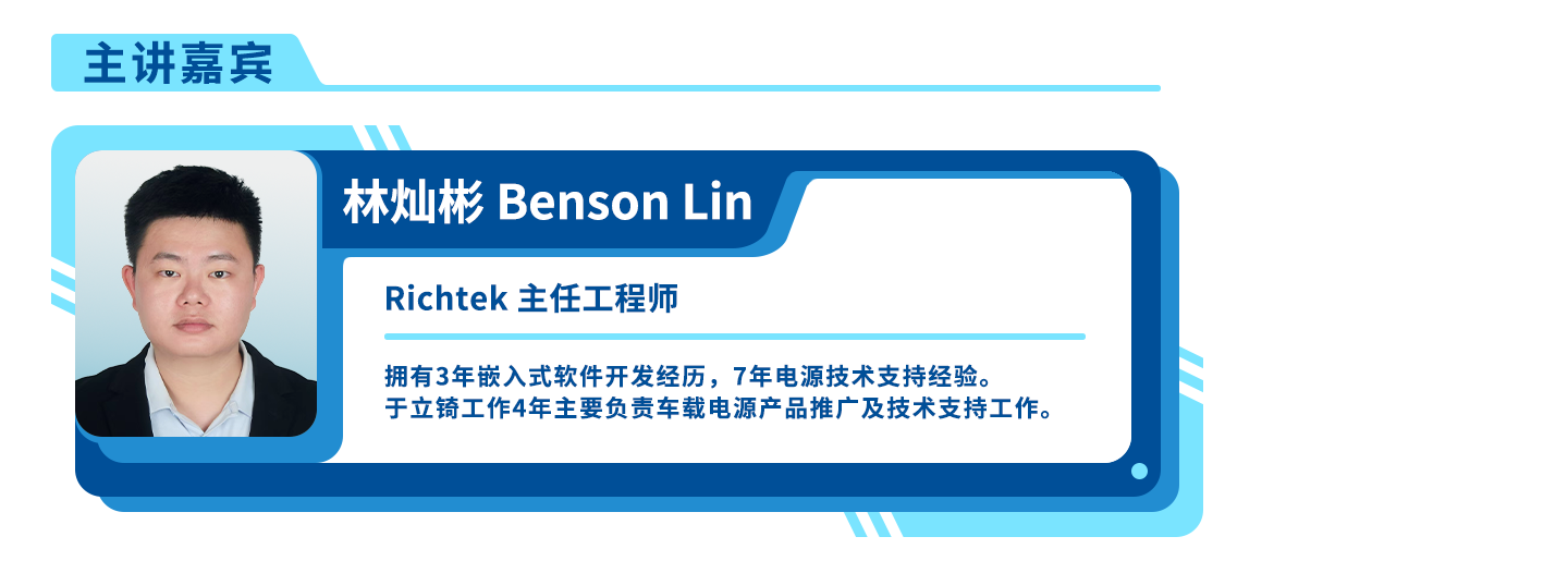 本次研讨会特邀 Richtek 技术专家 Benson将深入解析车载电源设计的关键技术方向,并现场分享多款适用于智能座舱与ADAS的电源方案,帮助工程师与研发团队掌握高集成设计在系统安全与性能优化中的应用实践。