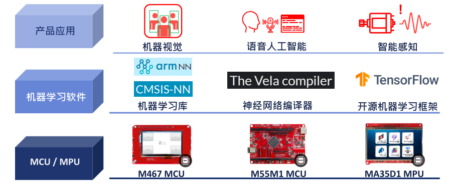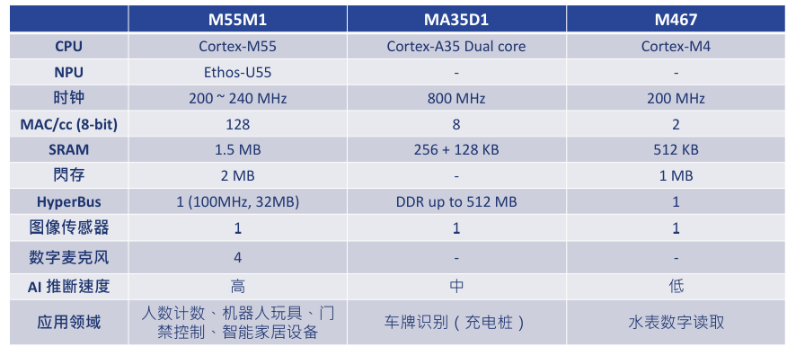 其 AI 推理能力在低功耗与无需外部 DDR 的前提下,仍可实现实时识别、人机交互、智能语音控制与边缘数据筛选。除了 NPU,M55M1 同样具备完整 Helium 向量处理器、超低功耗设计、USB PD、HyperRAM 扩展接口,是具备 “NPU + MCU” 双计算架构的先进 AI 微控制器平台。适用于终端智能识别、声音事件检测、图像分类与传感器融合等人工智能应用场景,尤其适合在功耗受限但仍需 AI 功能的场景中高效部署。