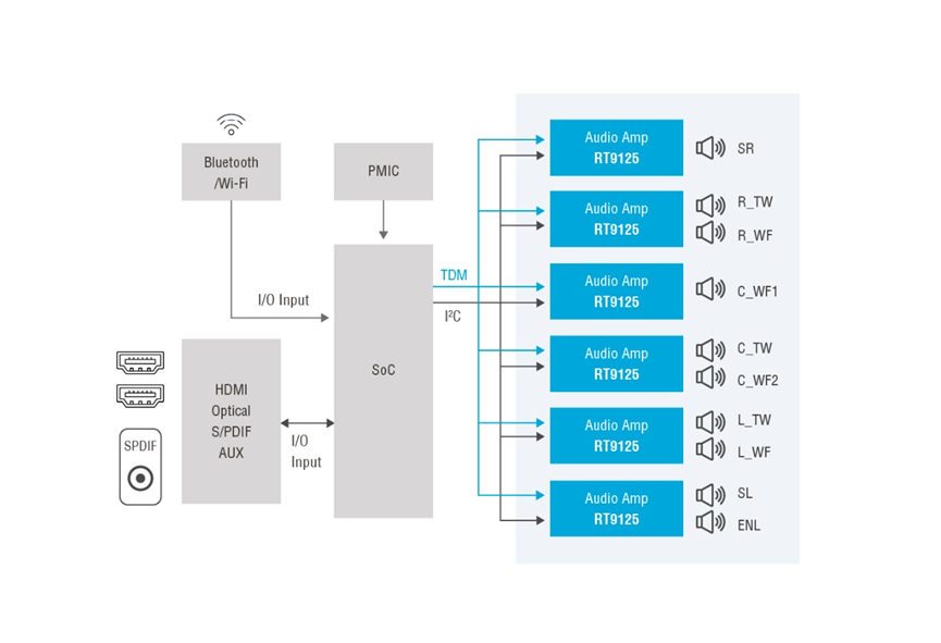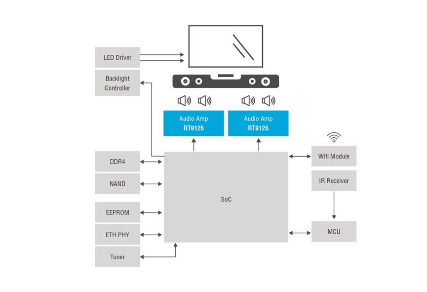RT9125 支持多达 16 组独立的 I²C 地址设定,特别适用于多声道系统,可大幅减少系统主控芯片(SoC)对多组 I²C 控制信号的需求,有效简化信号布线与接口设计。图6 展示了 RT9125 应用于 Soundbar 多声道音响系统的典型应用示意图;图7 则为其在 LCD/OLED 电视多声道系统中的参考应用范例。通过灵活的多地址设定,RT9125 能满足不同声道配置的需求,提升系统整合的灵活性。