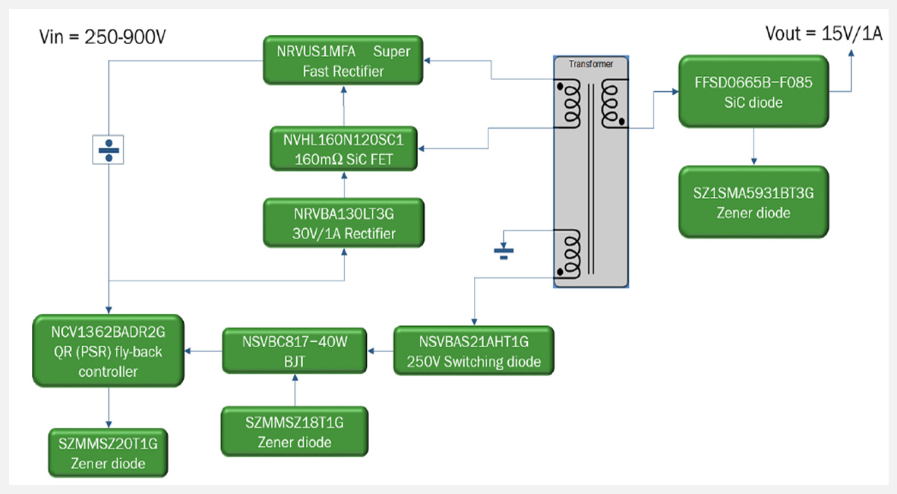 NCV1362控制器具备优异的驱动能力,可直接以12V操作碳化硅MOSFET,无需额外驱动器,简化布局并减少元件数量。反激式变压器提供4 kV隔离,并针对RCD缓冲器损耗进行优化设计,有效抑制高压输入下的漏极电压过冲,并为碳化硅MOSFET提供100V的安全裕度。