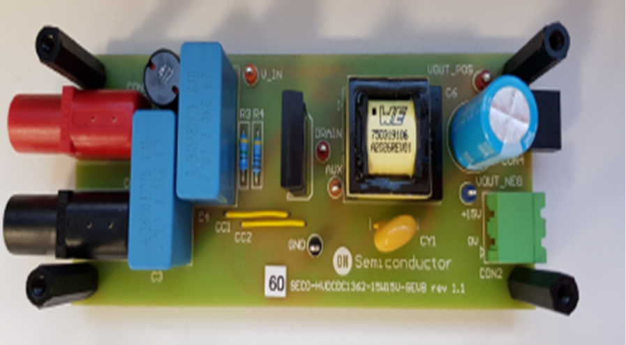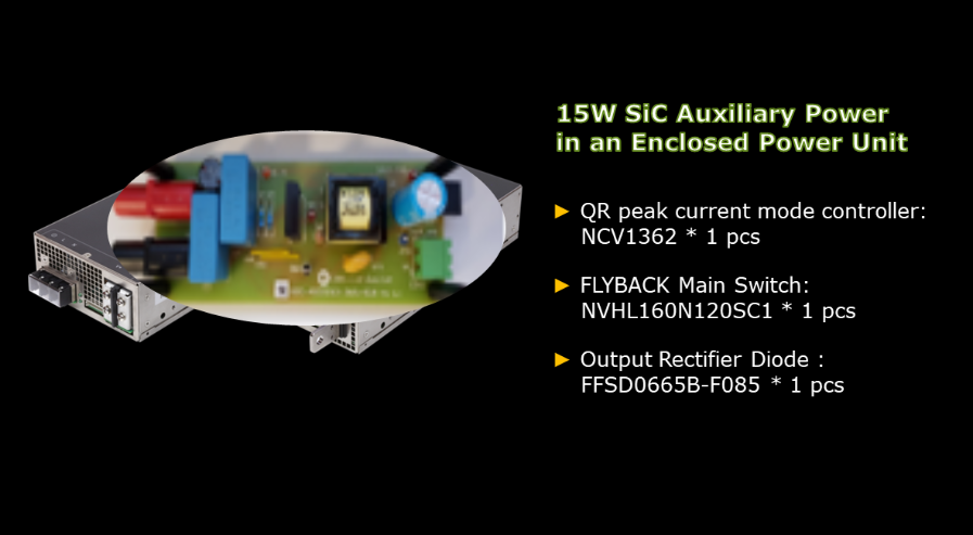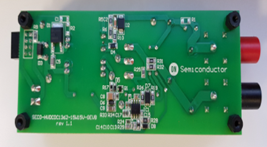 本开发板采用 NCV1362 准谐振峰值电流PSR反激控制器,搭配成本优化的 NVHL160N120SC1(160 mΩ、1200 V)碳化硅MOSFET与FFSP0665B-F085碳化硅二极管。碳化硅MOSFET具备高阻断电压与极低栅极电荷(34 nC),大幅降低开关损耗,使电路板在低压输入下仍能达到高达86%的效率。