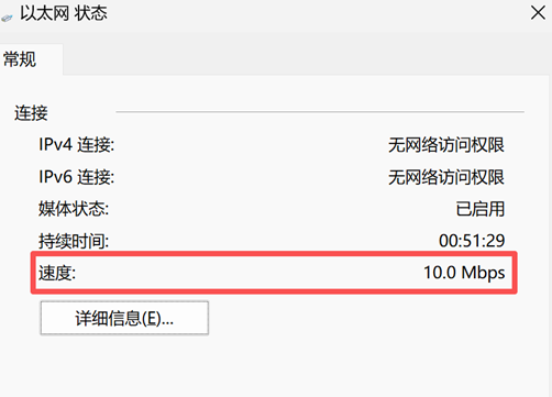 3. 查看对端电脑网卡连接速度,要求为10Mbps, 如不是,检查原因并确保最终link在10Mbps;