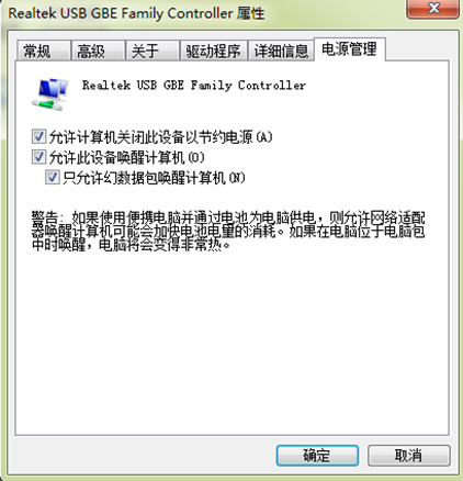 4. 如果在windows OS下测试,打开网卡属性里“电源管理”选项卡,勾选下图三个选项;