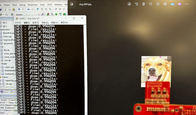 烧录后执行,可在终端机看到识别结果及识别率