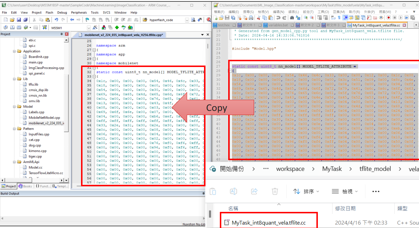 Edge AI识别物品,M55M1 MCU支持TFLite格式的神经网络,模型由TensorFlow框架训练,通过LiteRT(原称TensorFlow Lite)工具将神经网络权重量化为INT8格式,并通过Vela编译器将TFLite模型转换为Ethos-U55的指令,以便在NPU上执行。