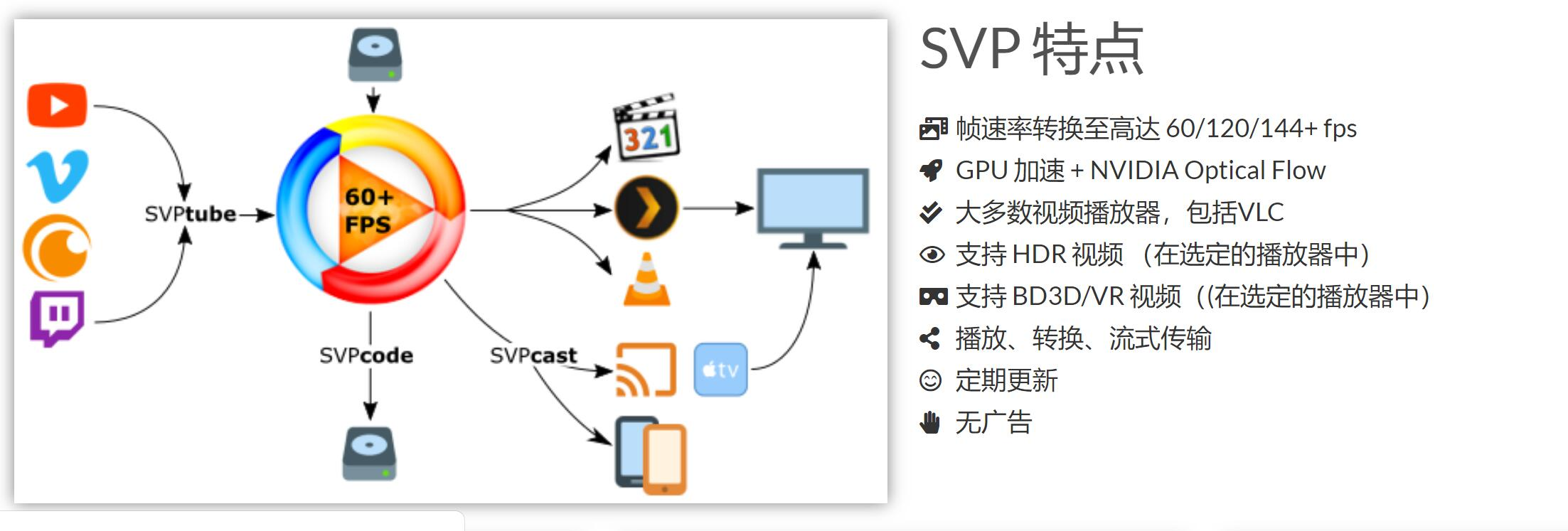 软件官方的介绍说“我们很高兴向陈旧的每秒 24 帧电影标准说再见。我们相信,对喜爱在 PC 上观看电影的人来说,SVP 是一款必备产品。SVP 将任何视频转换为 60+ fps(甚至更高)并在您最喜爱的视频播放器中实时完成。”
