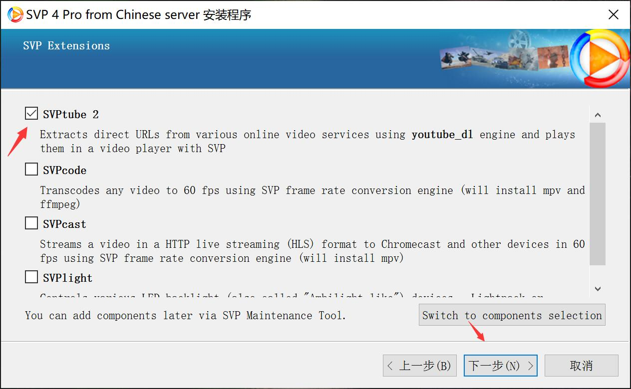 扩展组件,勾选SVPtube2 ,这个组件可以调用youtube_dl 直接播放油管的视频,当然你先得....能上油管。