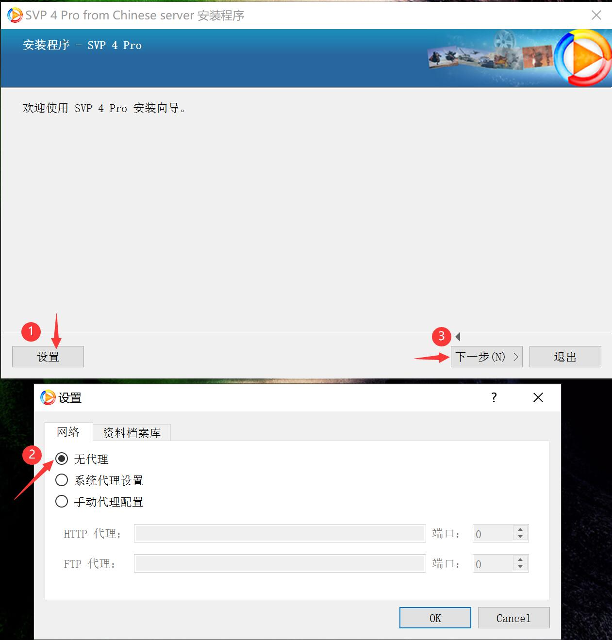SVP下载后获取到的软件为exe可执行文件,双击即可启动安装程序。安装第一步会联网获取一些内容,默认会使用系统代理,导致没有速度。这里可以通过点击设置,修改为无代理。