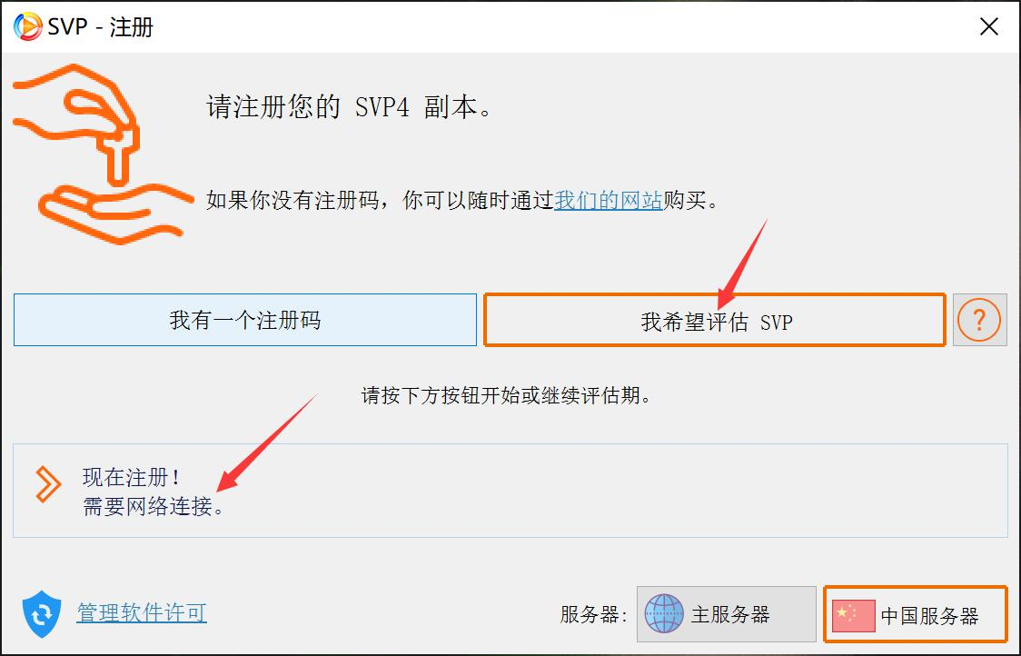 安装完成后,作为免费用户,可以选择“我希望评估svp” ,然后点下“现在注册” 。