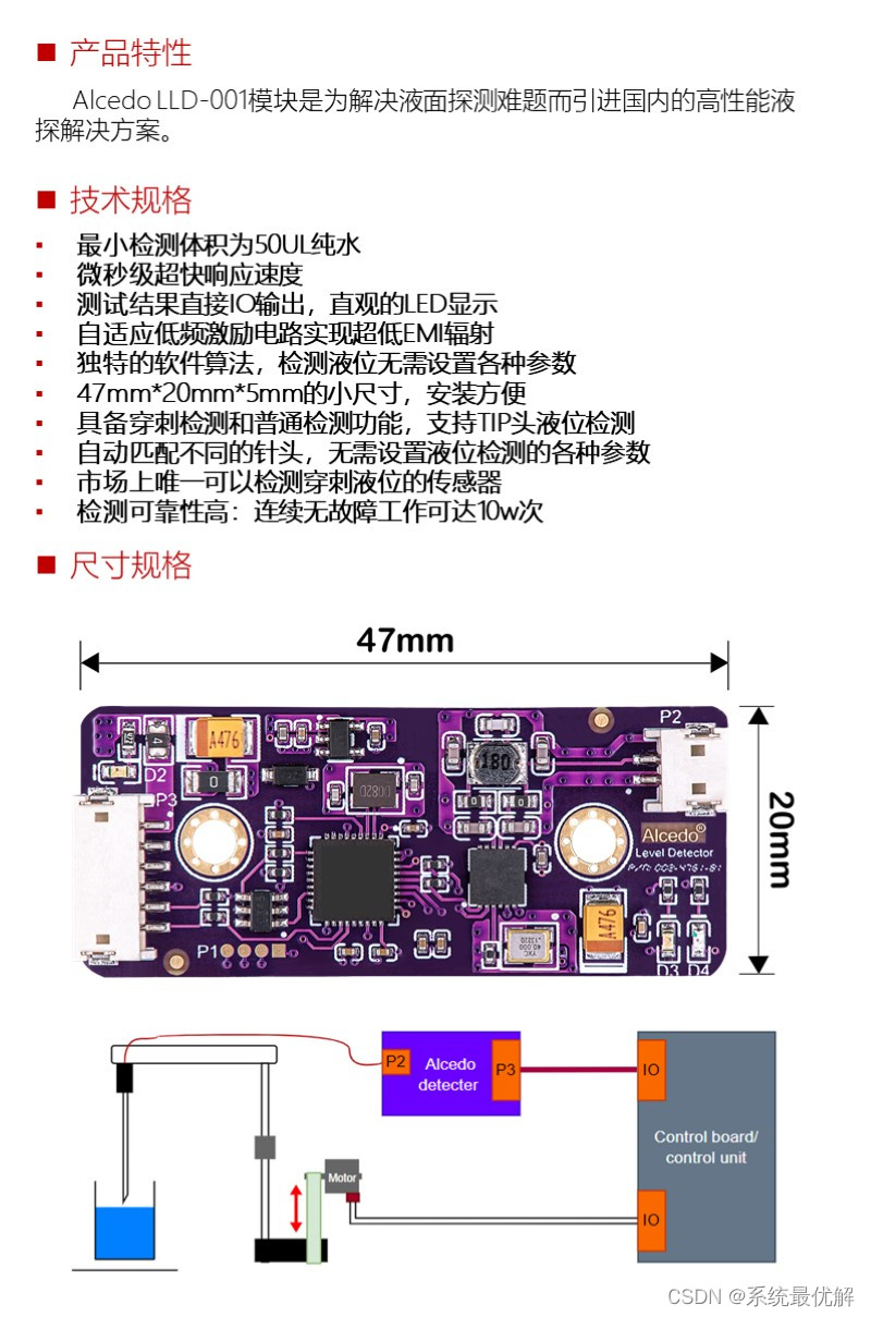 液面探测系统是医学临床全自动检验仪器必不可少的一项核心功能组件,其通过控制采样针探入待转移液体的深度,从而最大程度地解决因 采样针外表面附着液体引起的仪器交叉污染高和加样误差大的问题。高可靠、高灵敏度的液面探测系统不仅可降低采样针外表面液体携带量,同时也可避免仪器采样系统 “空吸”和“撞针”等误动作。