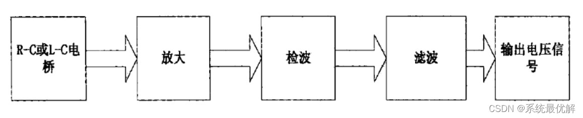 电桥法也叫调幅法,是将电容传感器作为电桥桥臂的一部分,通常采用R-C或L-C组成电桥,可调参考阻抗接在相邻的桥臂上,桥臂分别外接幅度相同,频率相同的电压信号,调节参考阻抗使电桥平衡。电路将电容的变化转换为电桥的电压输出,经过放大,检波,滤波等处理后输出与被测电容成正比关系的电压信号。其原理如下图所示。