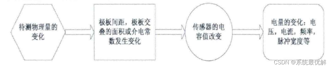 £表示电容极板间介质的介电常数:S表示两平行板所覆盖的面积:d表示两平行板间的距离。当被测量的非电量变化使得式中某一参数发生变化时,电容量C也随之变化。如果保持其中两个参数不变,而仅仅变化其中一个参数,就可以把该参数的变化转换成电容量的变化。通过检测电路将其转换为有用的信号输出,据此就可以知道被测量参数的情况。电容测量原理如下图所示:
