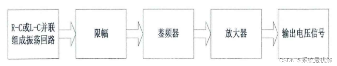 振荡法又称调频法,是基于电容-频率转换思想来检测电容。振荡电路的谐振回路通常由RC电路或L-C电路以及施密特触发器实现,其基本原理是将待测电容接入振荡电路中,使谐振回路的输出频率随待测电容的变化而变化,利用鉴频电路或计数电路将信号的频率变化转换成电压信号,通过检测电压值即可得到振荡电路中的电容值,其原理如下图所示。