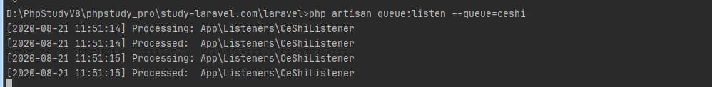 第四步、队列中已经有事件了,下面就执行一下该队列。如图所示:可以明显的看出,队列执行了两次,因为我触发了两次,redis里面呢,也是记录了两次。所以就执行了两次。
