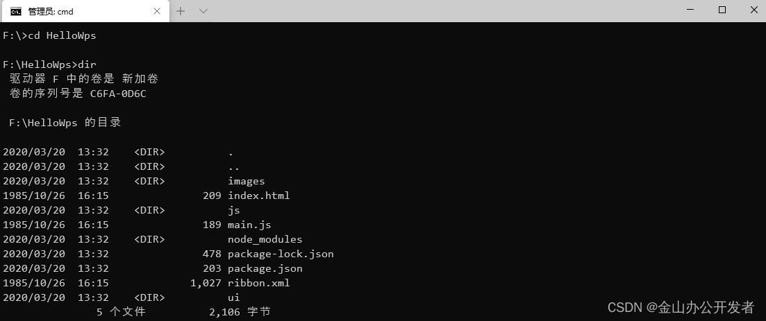 确认后wpsjs工具包会在当前目录下生成一个HelloWps的文件夹,我们进入到此文件夹,可以看到HelloWps的相关代码已经生成: