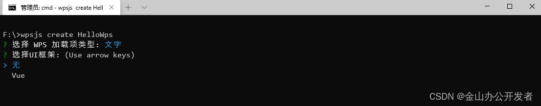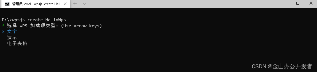 输入命令: wpsjs create HelloWps, 会出现如下图的几个选项:
