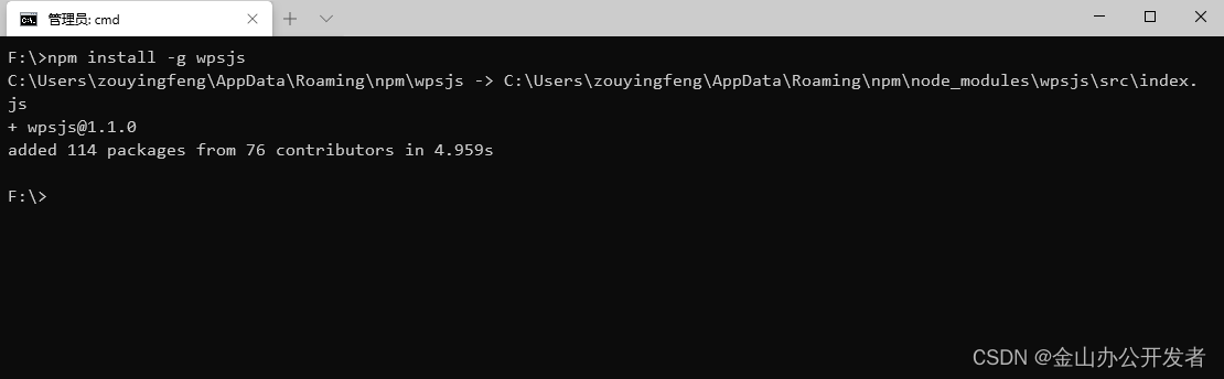 1、管理员权限(如果安装的是wps个人版,不需要管理员权限)启动命令行,通过npm全局安装wpsjs开发工具包: