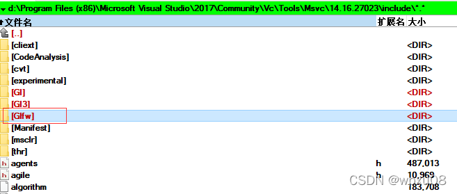 (1)include文件:将include文件夹中的Glfw文件拷贝到VC2017的包含目录下。如果VS2017安装在D盘,则为"d:\Program Files (x86)\Microsoft Visual Studio\2017\Community\VC\Tools\MSVC\14.16.27023\include".