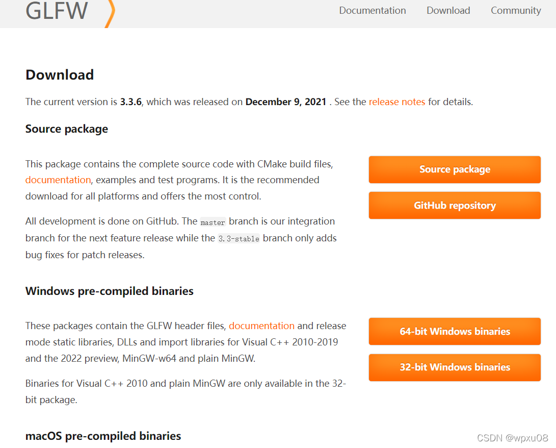 进入GLFW官网下载页面,可以直接下载windows pre-compiled binaries,为windows预编译版本,windows下可以直接调用,不需要下载源码进行cmake。此处32和64指的不是本机器的位数,而是生成目标的位数。