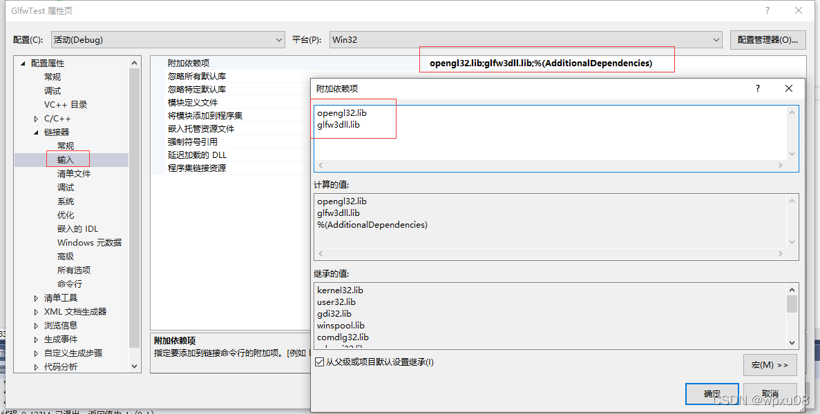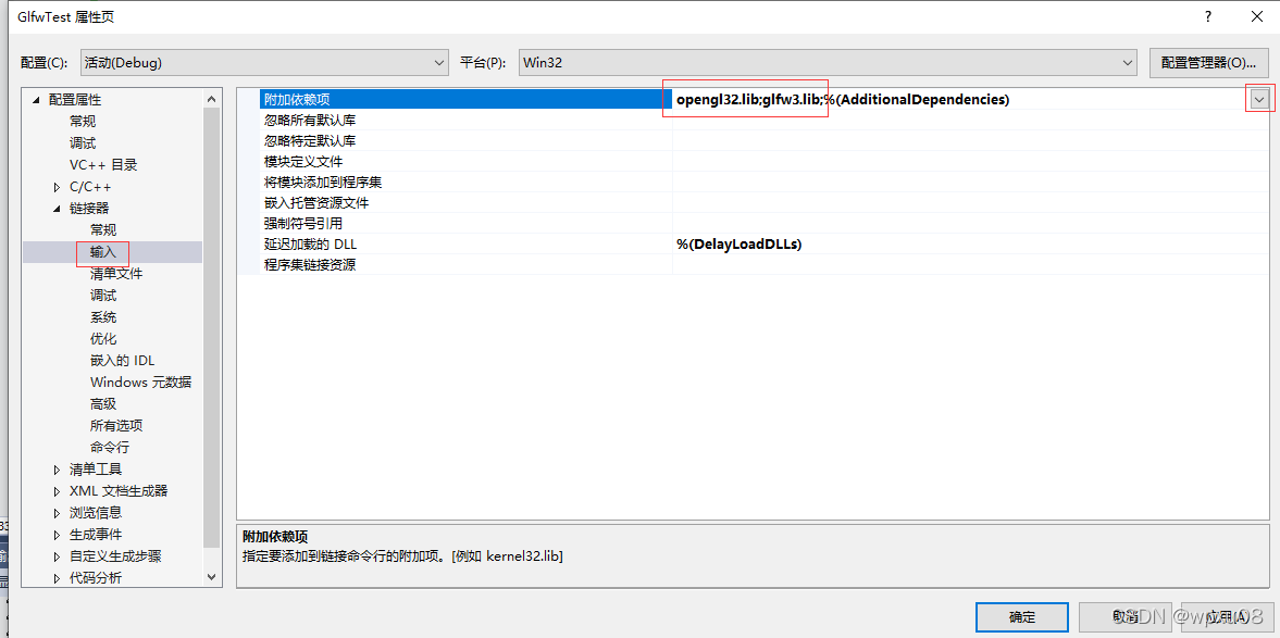 动态链接库方式设置要多一步。首先,在“连接器” ->“附加依赖项”中添加“opengl32.lib”和"glfw3dll.lib",用分号隔开;