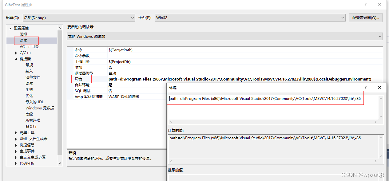 其次,在vs工程属性–>配置属性–>调试–>环境中设置:“path=d:\Program Files (x86)\Microsoft Visual Studio\2017\Community\VC\Tools\MSVC\14.16.27023\lib\x86”,告诉程序glfw3.dll的存放路径,如下图所示。