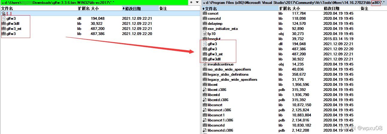 (2)lib文件:将lib-vc2017文件夹中的四个文件拷贝到"d:\Program Files (x86)\Microsoft Visual Studio\2017\Community\VC\Tools\MSVC\14.16.27023\lib\x86"文件夹下,如下图所示。