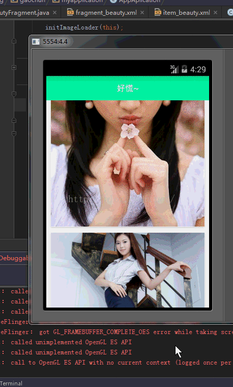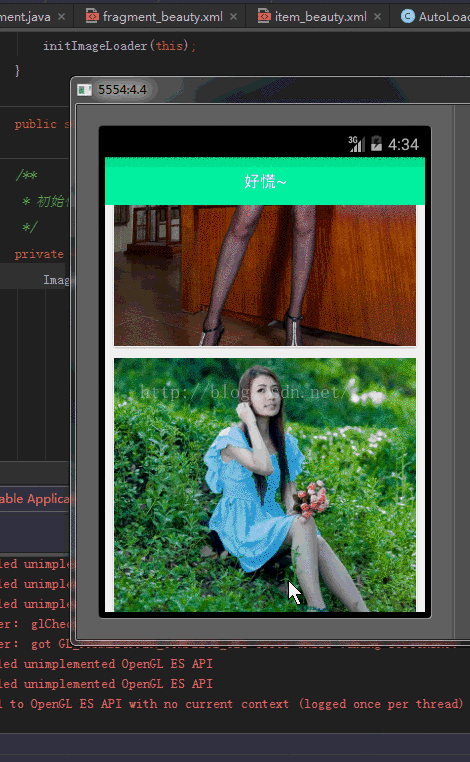我们就不自己去写那些异步加载图片,缓存啥的代码块了,简单明了,直接使用ImageLoader就可以。下面通过实例讲解该功能的实现,老规矩,先来效果图: