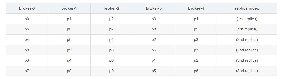 第一个replica怎么放,很简单,15/5,每个broker上依次放3个,如下图,012,345