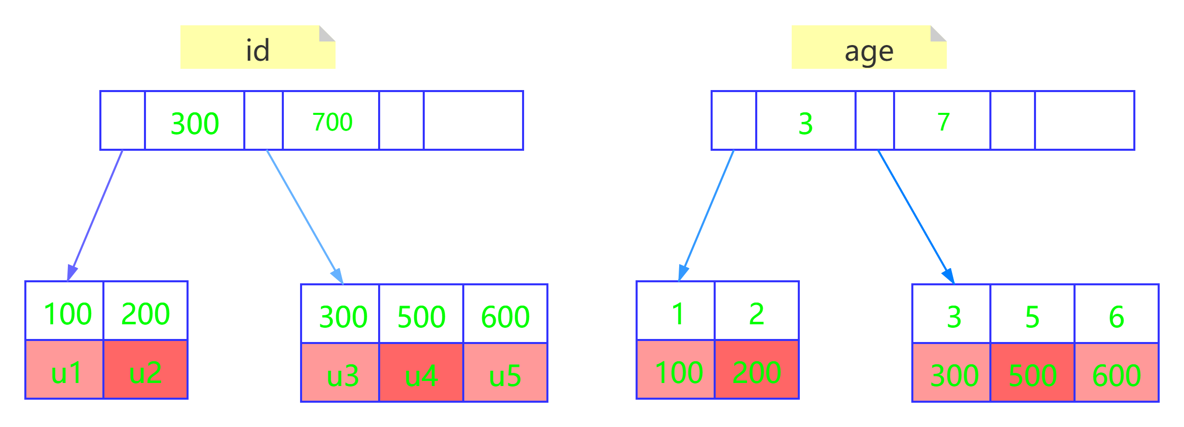 假设有一张User表(id,age,name,address),其中有id和age两个字段,其中id是主键,age是普通索引,有几行数据u1-u5的(id,age)的值是(100,1)、(200,2)、(300,3)、(500,5)和(600,6) ,此时的两棵树的示例如下: