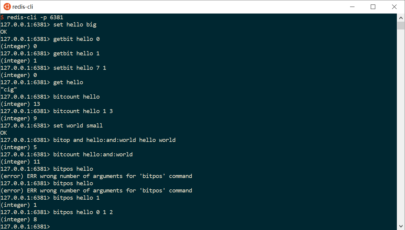 | bitpos key tartgetBit [start end] | 计算位图指定范围第一个偏移量对应的的值等于targetBit的位置 1. 找不到返回-1 2. start与end没有设置,则取全部 3. targetBit只能取0或者1 |